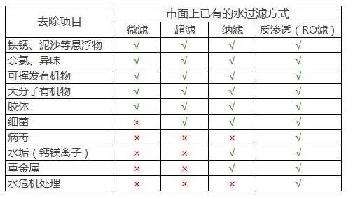 净水方式目前分为RO膜、纳滤膜、超滤膜、微滤膜四种。这几种不同的净水方式得到的效果也不相同,最初级就是最粗的过滤就是微滤,最好的就是RO膜(反渗透)。当然,价格也是从粗过滤到惊喜过滤而由低到高。通过下面一个表格就能清楚地看到各级的过滤效果。